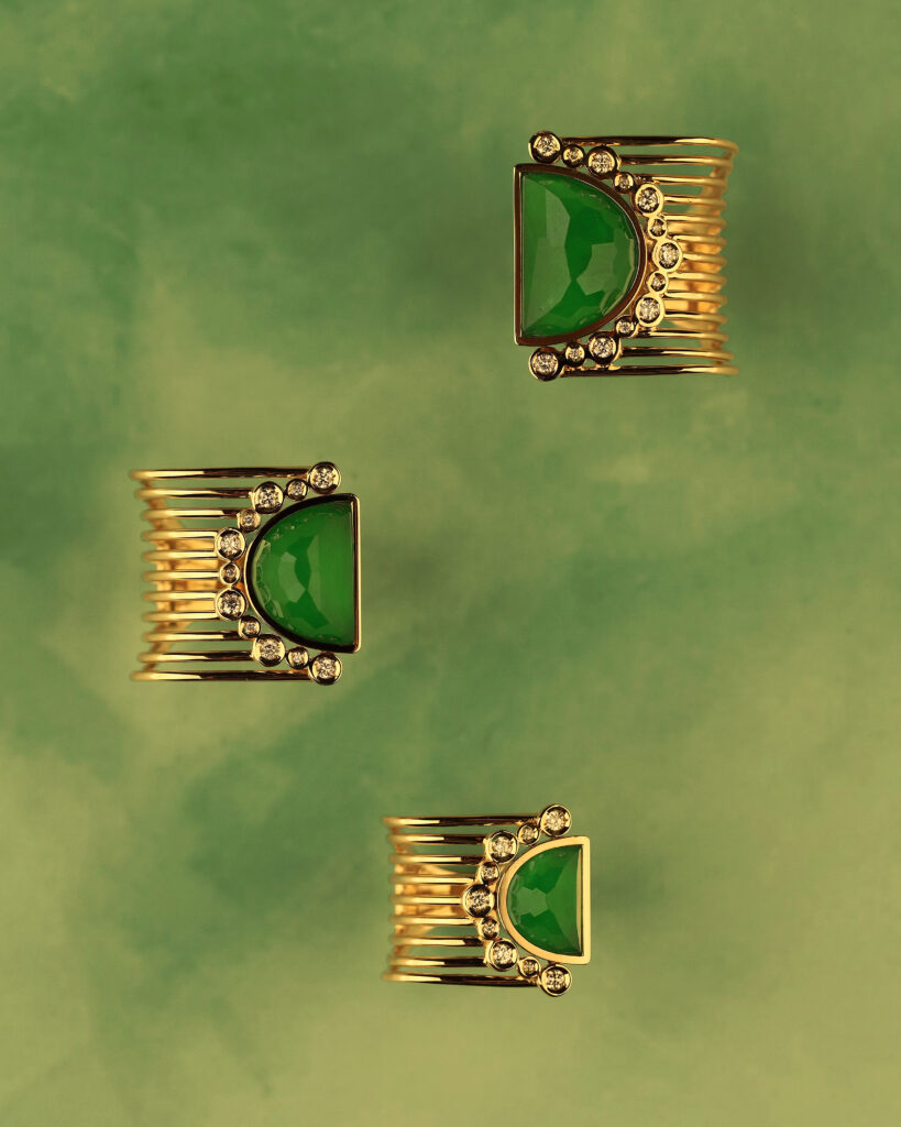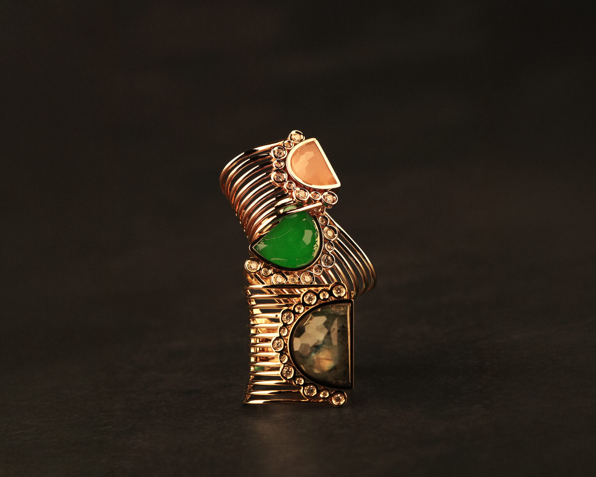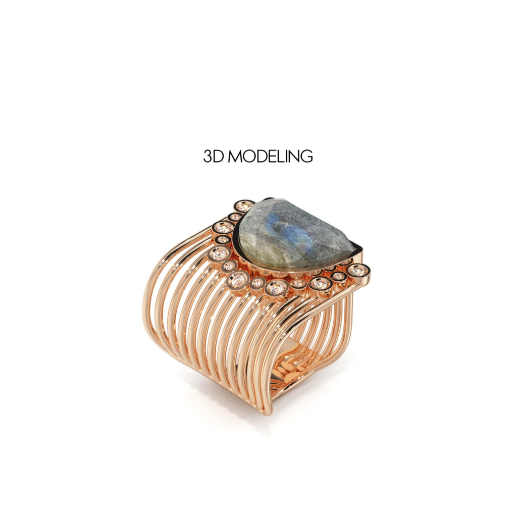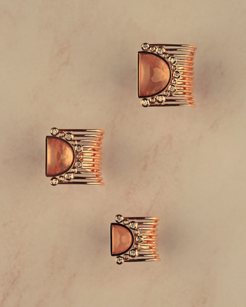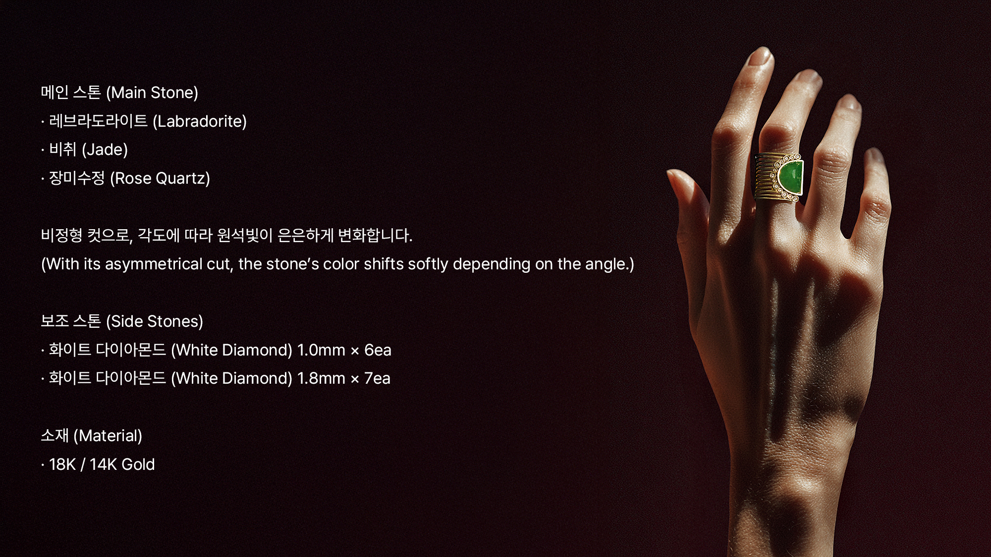 At the center sits a mystical half-moon–shaped gemstone, surrounded by a halo of White diamonds that add a brilliant touch of sparkle. The multi-layered metal lines form an elegant curve, bringing refined sophistication to the finger. Blending luxury with modern aesthetics, this piece is the perfect statement ring to illuminate your most special moments.