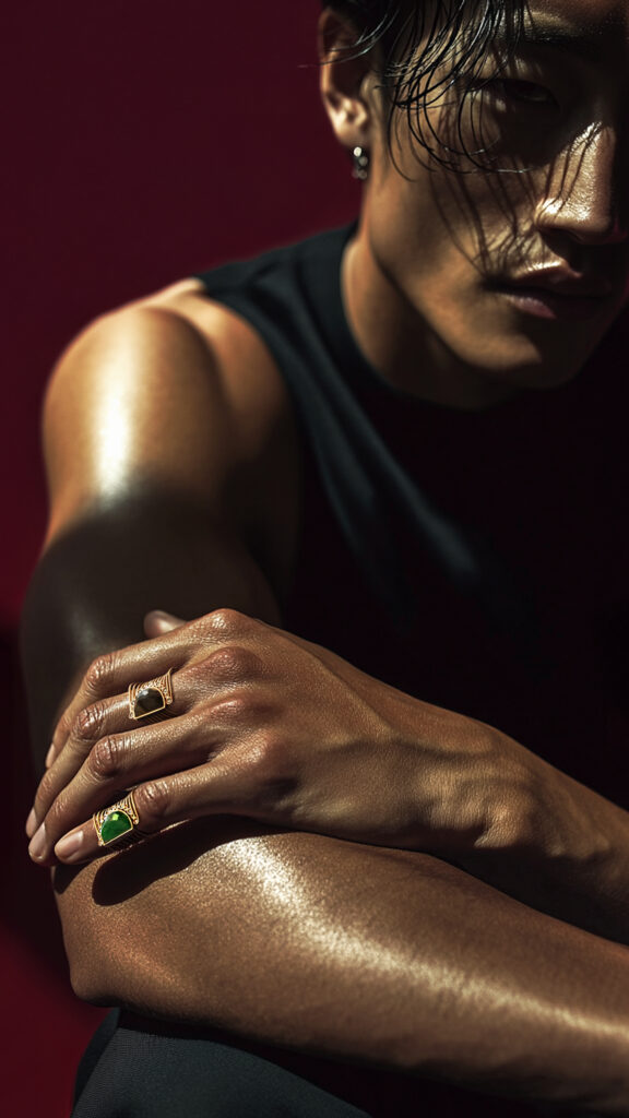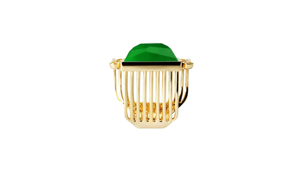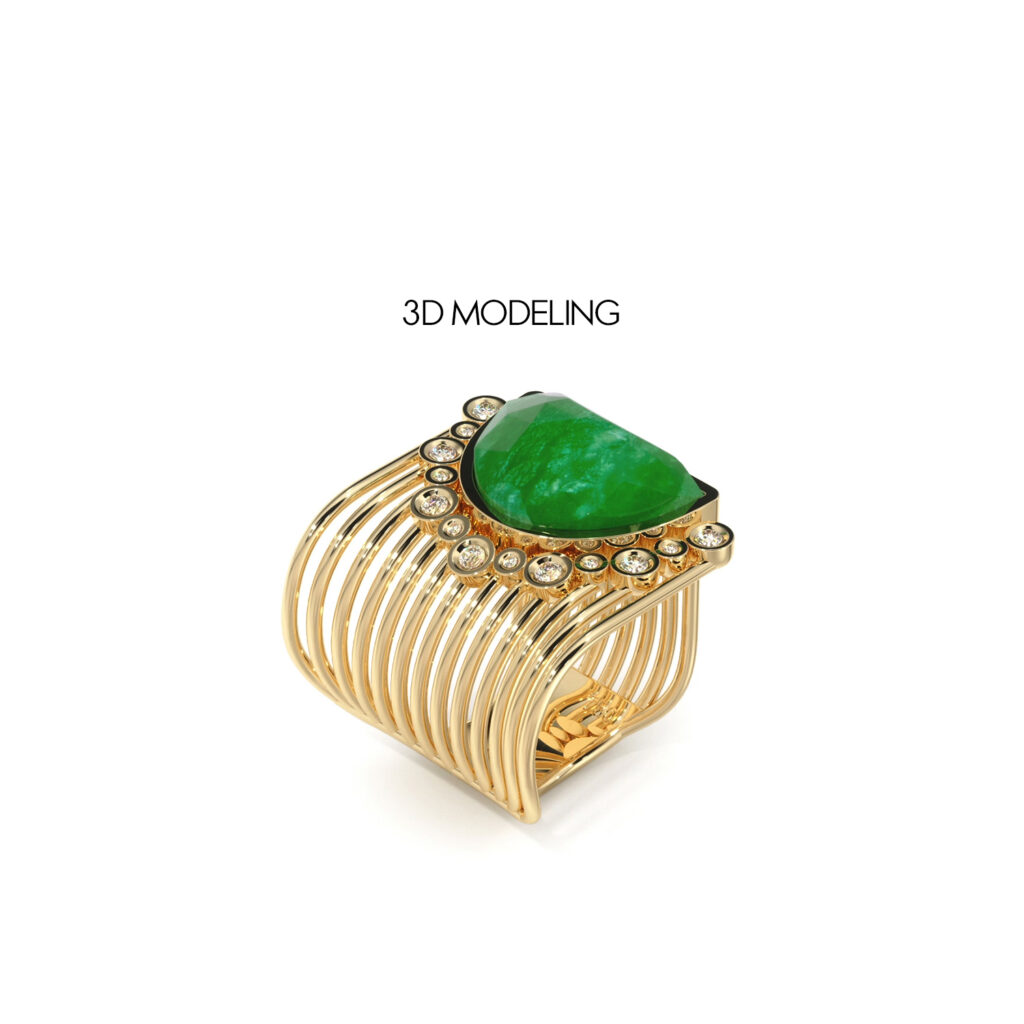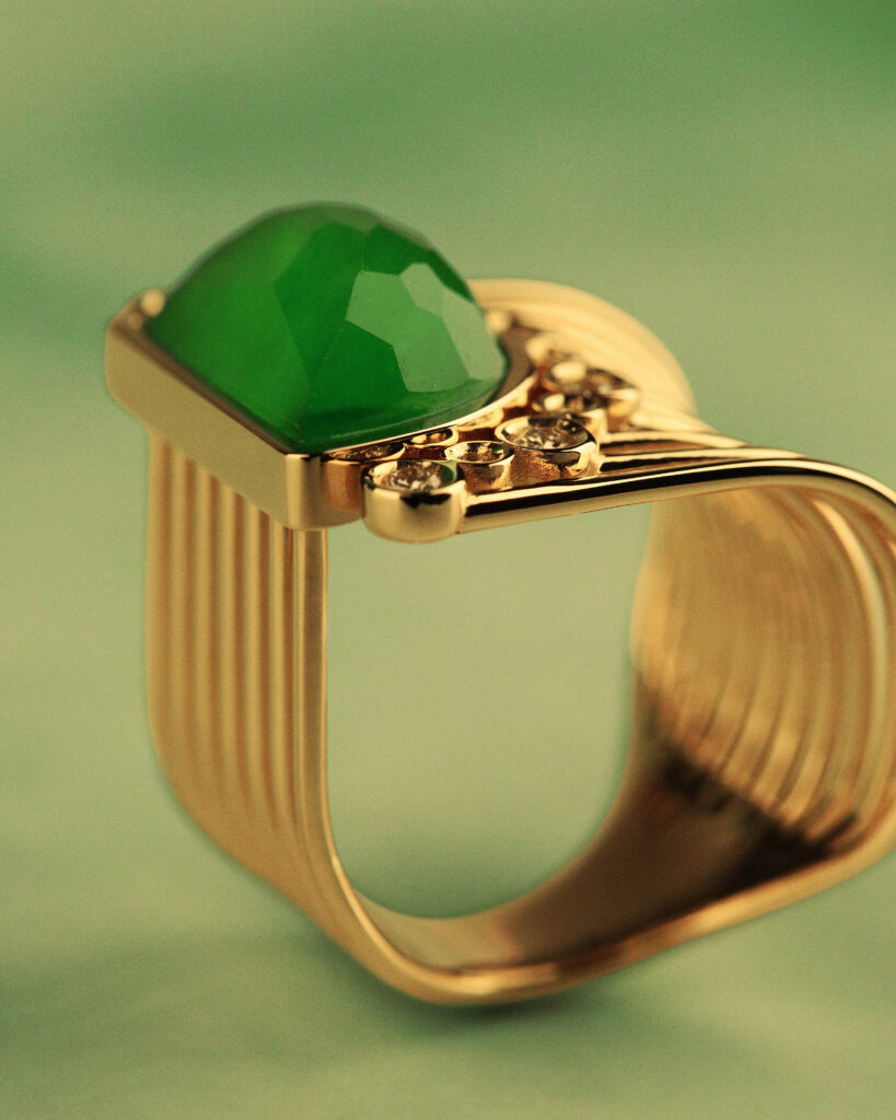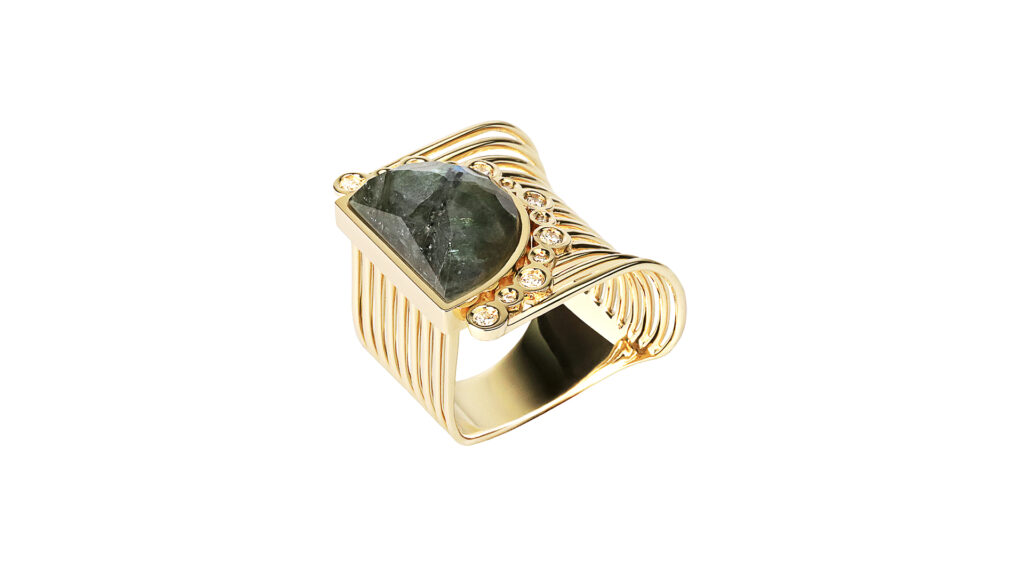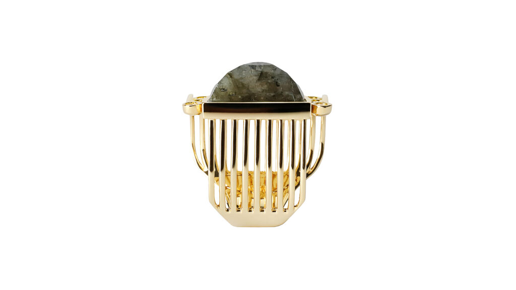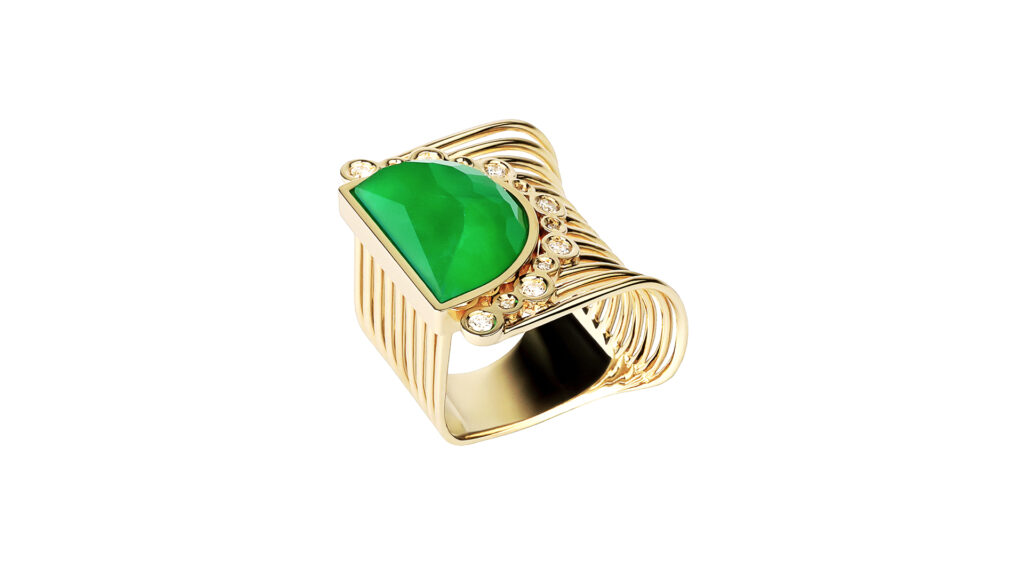 At the center sits a mystical half-moon–shaped gemstone, surrounded by a halo of White diamonds that add a brilliant touch of sparkle. The multi-layered metal lines form an elegant curve, bringing refined sophistication to the finger. Blending luxury with modern aesthetics, this piece is the perfect statement ring to illuminate your most special moments.