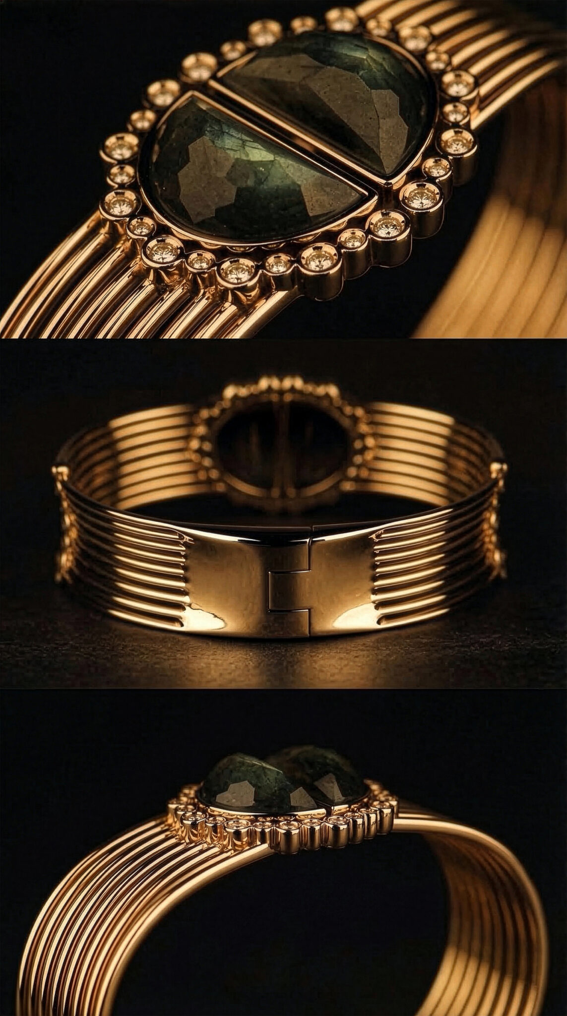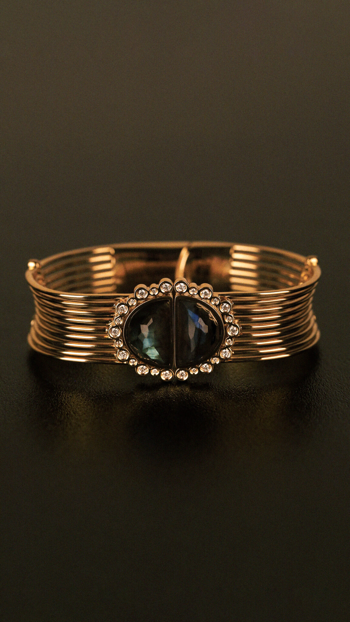 This exquisite bracelet combines luxurious design with intricate details, showcasing a unique and captivating charm. At its center lies a mystical Labradorite stone, surrounded by a halo of diamonds that add a brilliant sparkle. The multi-layered metal band forms an elegant curve, enhancing the bracelet’s sophistication and adding a refined touch to the wearer’s wrist. Blending luxury with modern aesthetics, this piece is the perfect choice to shine as a statement jewelry item for special occasions.